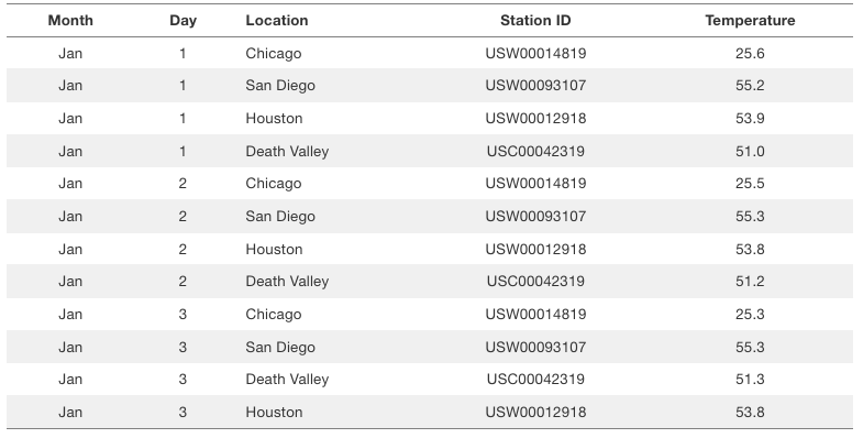 이 표는 미국의 네 지역에 대한 일일 온도 기준값(30년 동안의 평균 일일 온도)을 제공하는 데이터셋의 처음 몇 개의 행을 보여줍니다. 이 표에는 다섯 가지 변수가 포함되어 있습니다: 월, 일, 위치, 측정소 ID, 그리고 온도(화씨 단위). 월(month)은 순서가 있는 요인(ordered factor)이고, 일(day)은 이산적 숫자 값(discrete numerical value)입니다. 위치(location) 는 순서가 없는 요인(unordered factor)이며, 측정소 ID(station ID) 도 마찬가지로 순서가 없는 요인입니다. 마지막으로, 온도(temperature) 는 연속적 숫자 값(continuous numerical value)입니다.