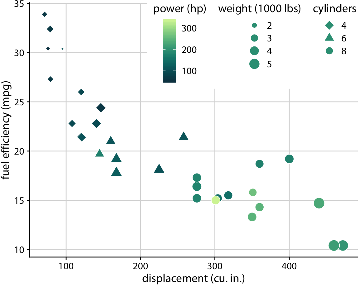 한 번에 세 개 이상의 스케일을 사용할 수도 있습니다. 이 도표는 데이터를 나타내기 위해 다섯 개의 별도 스케일을 사용합니다: (i) x축(displacement,배기량); (ii) y축(fuel efficiency,연비); (iii) 데이터 포인트의 색상(power); (iv) 데이터 포인트의 크기(weight); (v) 데이터 포인트의 모양(cylinders).