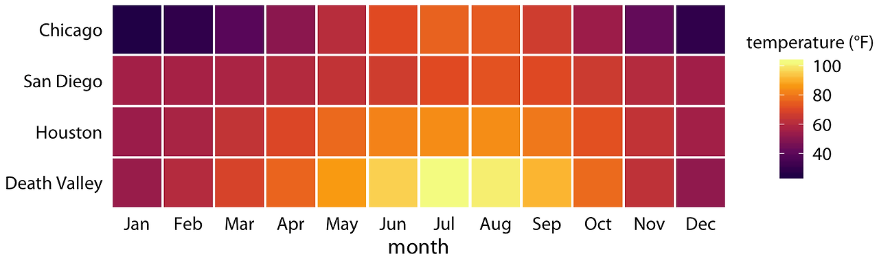 반대로 주요 관심 변수인 온도가 색상으로 표시되므로, 색상이 유용한 정보를 전달할 수 있도록 충분히 큰 색상 영역을 보여줘야 합니다. 따라서 이 시각화에서는 선 대신 각 월과 위치에 하나씩 사각형을 선택했으며, 각 월의 평균 온도 기준값에 따라 색상을 입혔습니다.