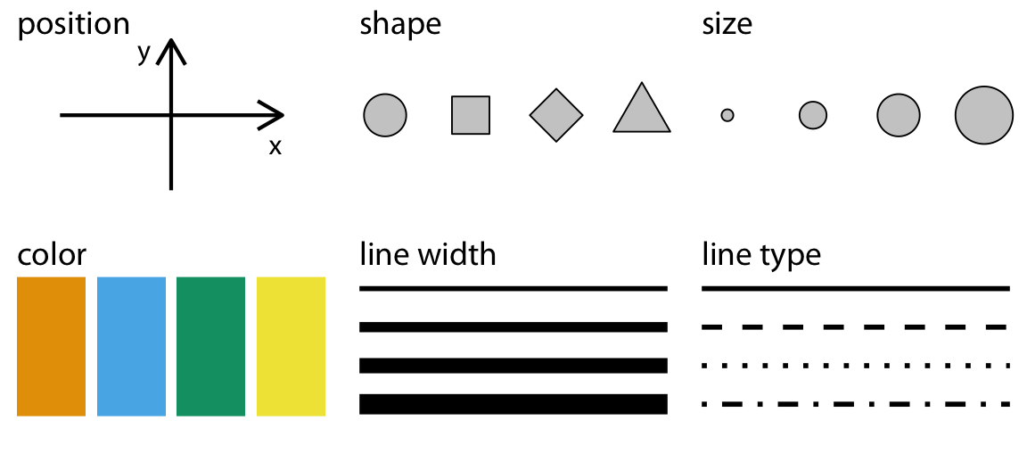 모든 그래픽 요소의 중요한 구성 요소는 그 위치입니다. 이는 요소가 어디에 위치하는지를 설명합니다. 다음으로, 모든 그래픽 요소는 모양, 크기, 색상을 가지고 있습니다. 마지막으로, 데이터를 시각화하기 위해 선을 사용할 경우, 이 선들은 다른 너비나 점선–실선 패턴을 가질 수 있습니다.