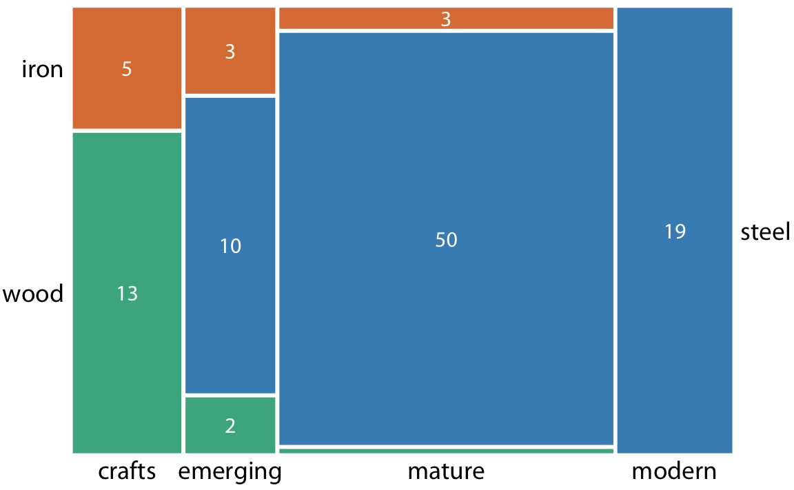 두 개의 추가 건설 시기, 즉 'emerging'(1870년부터 1889년까지)과 'mature'(1890년부터 1939년까지)를 볼 수 있습니다. '수공예'와 '현대적'이라는 시기와 결합하여, 이 건설 시기들은 데이터셋의 모든 다리를 포함하며, 세 가지 건설 재료 역시 마찬가지입니다. 이는 모자이크 플롯의 중요한 조건입니다. 표시된 모든 범주형 변수는 데이터셋의 모든 관측치를 포함해야 합니다.