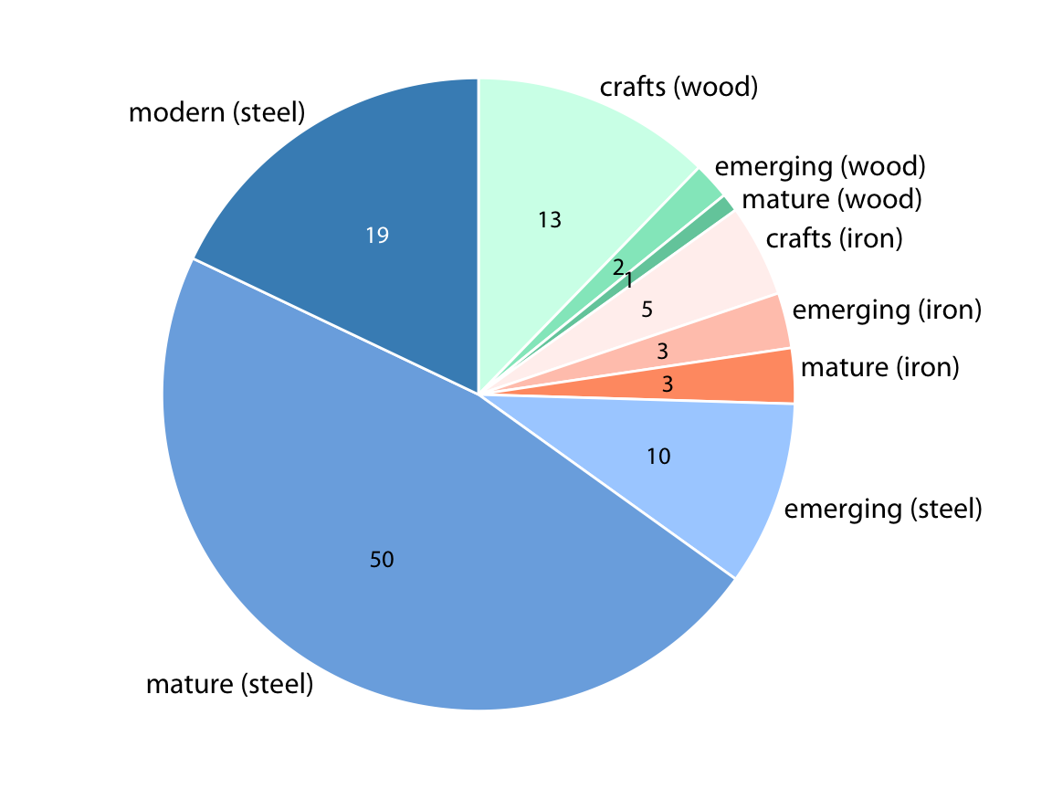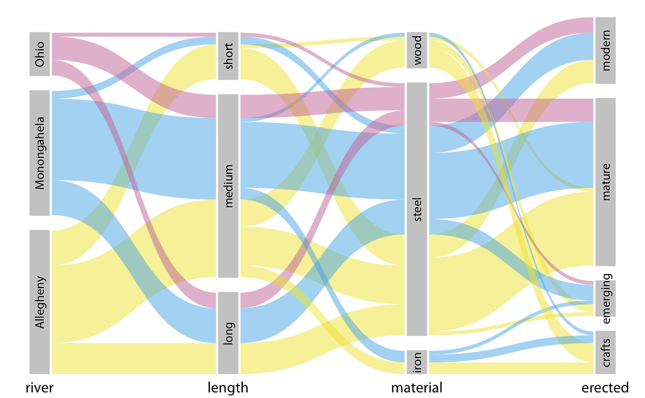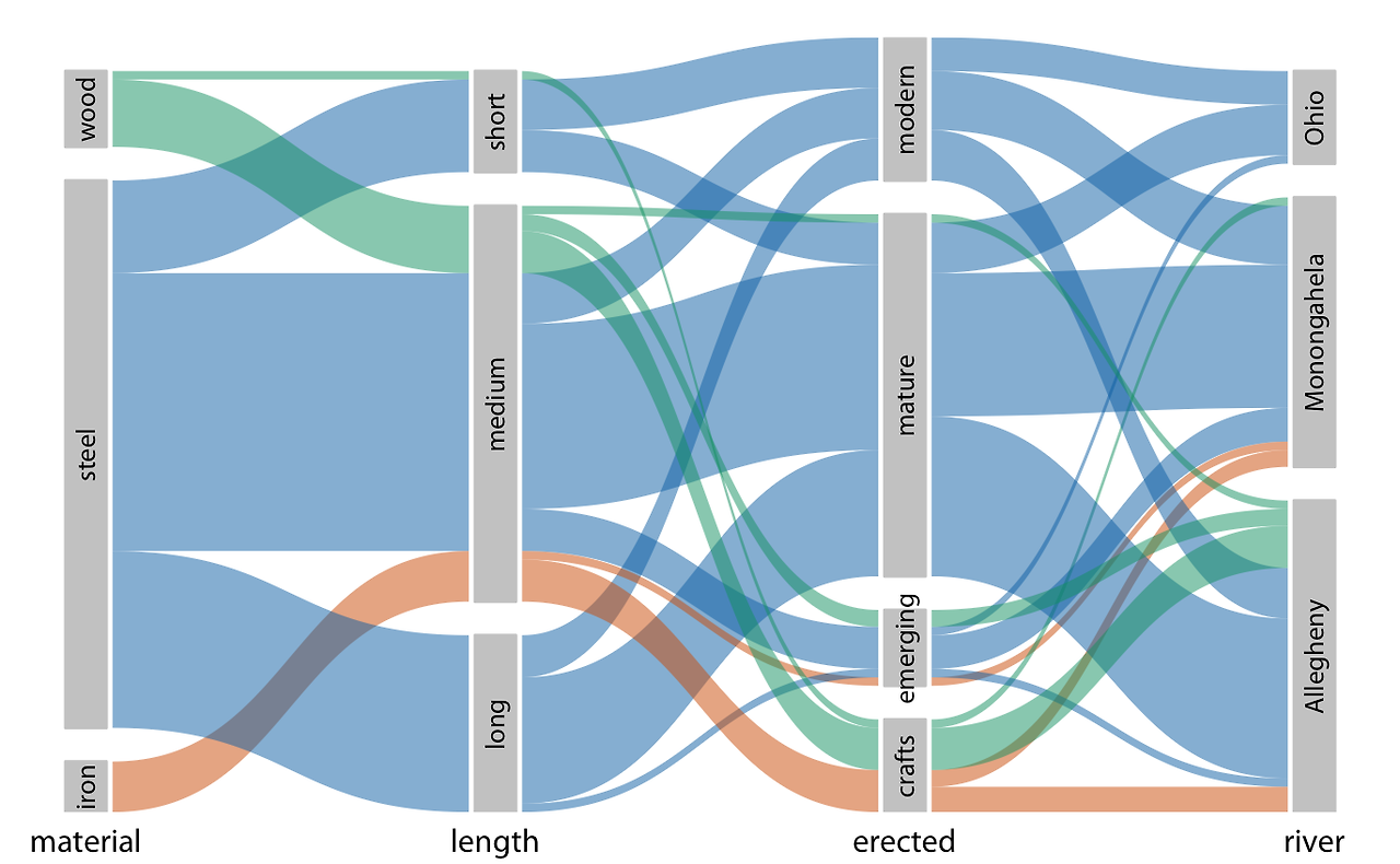목재 다리들은 대부분 중간 길이이며(짧은 다리 몇 개 포함), 주로 수공예 시기에 건설되었고(몇 개의 중간 길이 다리는 emerging 및 mature 시기에 건설됨), 주로 Allegheny 강에 걸쳐 있다는 것을 보여줍니다(수공예 다리 몇 개는 Monongahela 강에 걸쳐 있음). 반면, 철제 다리는 모두 중간 길이이며, 주로 수공예 시기에 건설되었고, Allegheny와 Monongahela 강에 거의 같은 비율로 걸쳐 있습니다.