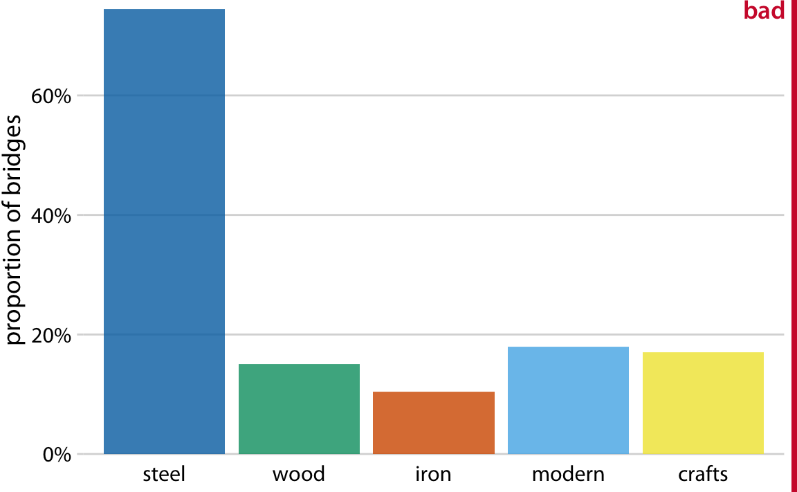 중복 계산이 항상 문제인 것은 아닙니다. 100%로 합산될 필요가 없는 시각화를 선택하면 됩니다. 이전 장에서 논의한 바와 같이, 나란히 배치된 막대 그래프는 이러한 기준을 충족시킵니다. 여러 유형의 다리들을 하나의 플롯에서 막대로 보여줄 수 있으며, 이는 기술적으로 틀린 것은 아닙니다(그림 11.2). 그럼에도 불구하고 이 그림에 "나쁨"이라는 레이블을 붙인 이유는, 일부 범주가 겹친다는 점을 즉시 보여주지 않기 때문입니다. 그림 11.2를 보고 대충 보면, 다섯 개의 별도 범주가 존재한다고 오해할 수 있으며, 예를 들어, 현대적 다리가 강철이나 목재, 철로 만들어지지 않았다고 결론지을 수도 있습니다.
