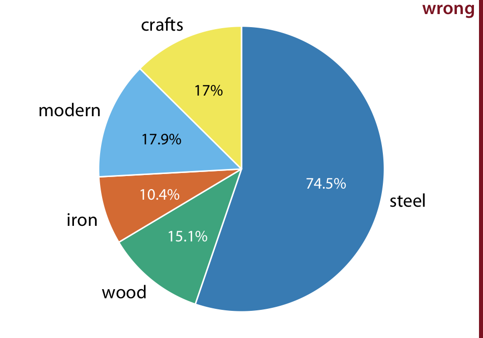 피츠버그의 다리들을 건설 재료(강철, 목재, 철)와 건설 연도(수공예, 1870년 이전; 현대적, 1940년 이후)에 따라 나눈 비율을 파이 차트로 나타낸 것입니다. 각 유형의 다리가 전체 다리에서 차지하는 비율을 숫자로 표시하고 있습니다. 그러나 이 그림은 잘못된 것입니다. 왜냐하면 이 비율들이 100%를 넘기 때문에 유효하지 않기 때문입니다. 건설 재료와 건설 연도 간에 중복이 있기 때문에 이러한 문제가 발생합니다. 예를 들어, 모든 현대적 다리는 강철로 만들어졌고, 대부분의 수공예 다리는 목재로 만들어졌습니다.