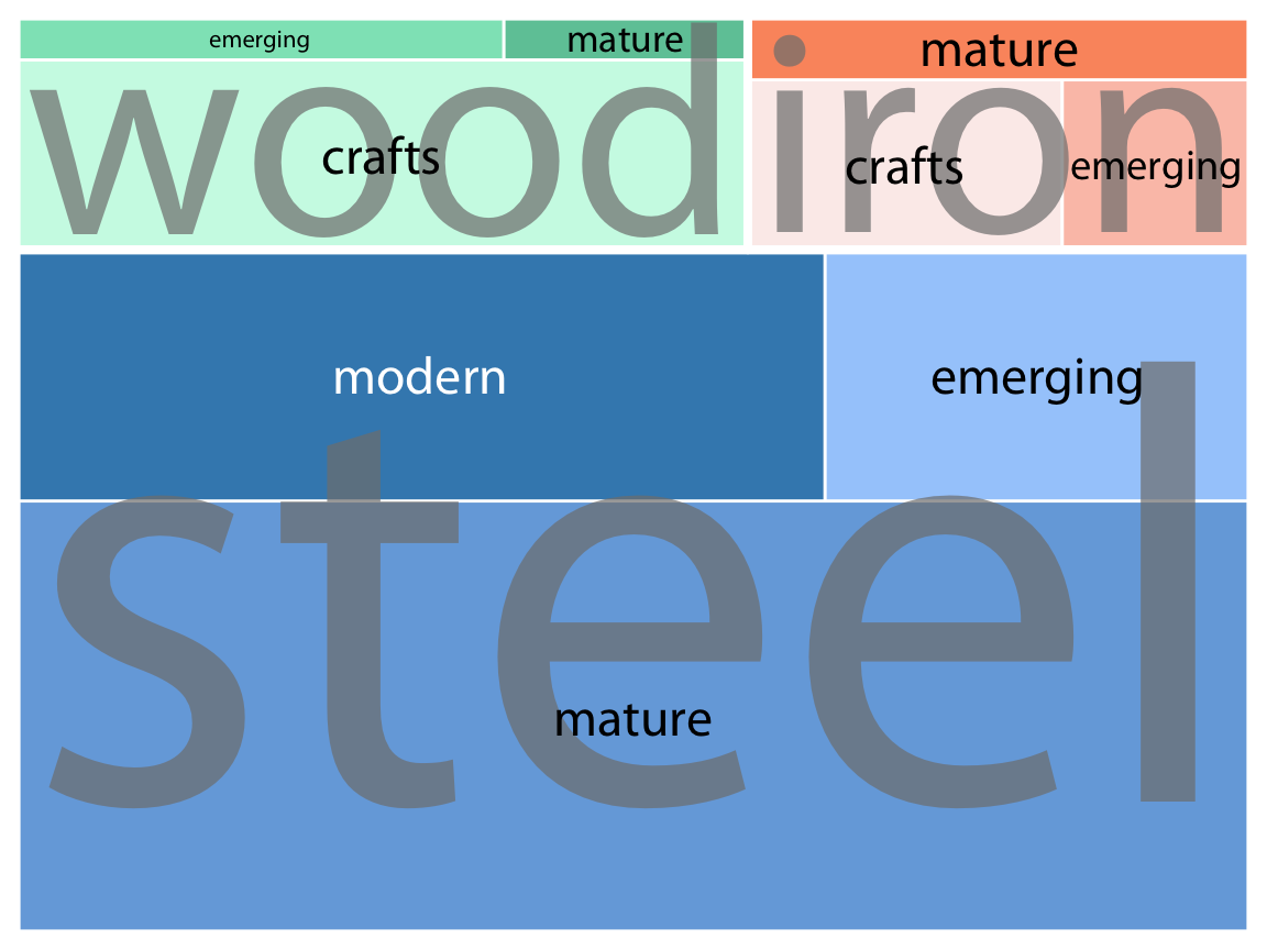 이 다리 데이터셋은 트리맵이라는 형식으로도 시각화할 수 있습니다. 트리맵에서는 모자이크 플롯과 마찬가지로, 전체 사각형을 비율을 나타내는 더 작은 사각형으로 세분화합니다. 그러나 작은 사각형을 큰 사각형 안에 배치하는 방법이 모자이크 플롯과 다릅니다. 트리맵에서는 사각형들을 서로 안쪽에 재귀적으로 중첩시킵니다. 예를 들어, 피츠버그 다리의 경우, 전체 면적을 먼저 세 가지 건설 재료(목재, 철, 강철)를 나타내는 부분으로 나누고, 그런 다음 각 건설 재료의 면적을 건설 시기에 따라 다시 세분화할 수 있습니다. 이론적으로는 계속해서 더 작은 세분화를 중첩시킬 수 있지만, 그럴 경우 결과가 금세 다루기 힘들거나 혼란스러워질 수 있습니다.