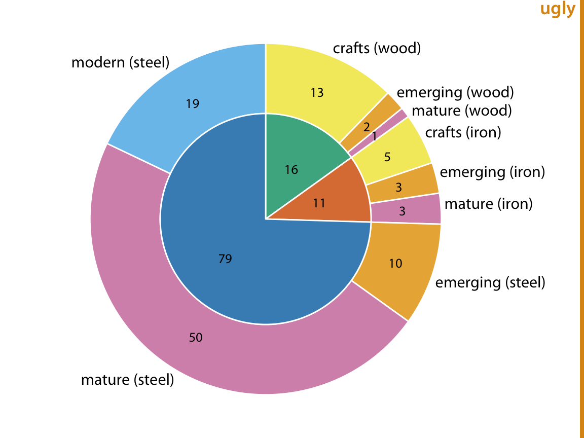 첫내부 원과 외부 원으로 구성된 파이 차트를 그릴 수 있습니다. 내부 원은 한 변수(여기서는 건설 재료)에 따른 데이터를 보여주고, 외부 원은 내부 원의 각 조각을 두 번째 변수(여기서는 다리 건설 시기)에 따라 나눈 비율을 보여줍니다. 이 시각화는 합리적이지만, 나는 약간의 우려가 있어 이를 "보기 싫음(ugly)"이라고 표시했습니다. 가장 중요한 문제는 두 개의 별도 원이 데이터셋의 각 다리가 건설 재료와 다리 건설 시기를 모두 가진다는 사실을 흐리게 한다는 점입니다. 결과적으로, 여전히 각 다리를 이중으로 계산하고 있습니다. 두 개의 원에 표시된 모든 숫자를 합치면 212가 되는데, 이는 데이터셋에 있는 다리 수의 두 배입니다.