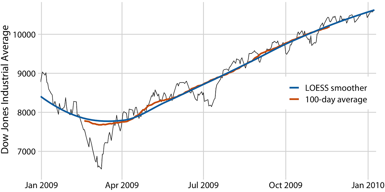 통계학자들은 이러한 이동 평균의 단점을 완화하기 위해 더 복잡하고 계산 비용이 많이 드는 평활화 방법들을 개발했습니다. 그 중 널리 사용되는 방법 중 하나가 LOESS(Locally Estimated Scatterplot Smoothing)입니다. 이 방법은 데이터의 하위 집합에 저차 다항식을 맞추며, 각 하위 집합의 중앙에 있는 점에 더 많은 가중치를 부여하여 이동 평균보다 훨씬 부드러운 결과를 얻습니다.