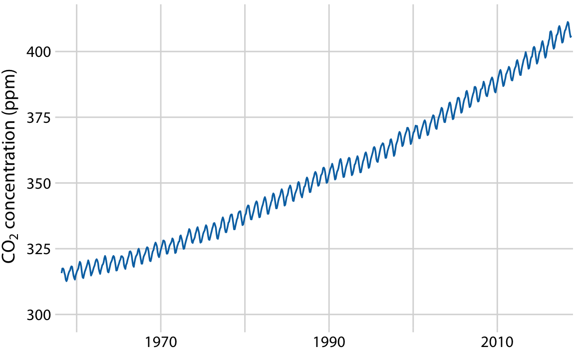 이 곡선은 대기 중 이산화탄소(CO2) 농도의 변화를 시간에 따라 나타낸 것입니다. 장기적인 추세, 계절 변동, 나머지 구성 요소로 분해할 수 있습니다.
