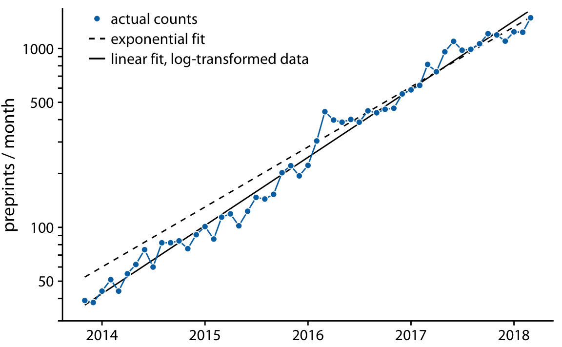 따라서, y 값을 로그 변환하여 플로팅하거나 로그 y 축을 사용하여 데이터를 플로팅하면 선형 관계를 찾는 것이 데이터가 지수 성장(exponential growth)을 보이는지 여부를 판단하는 좋은 방법입니다. 실제로, bioRxiv 제출 건수 데이터에서 로그 y 축을 사용하면 선형 관계를 얻을 수 있습니다.