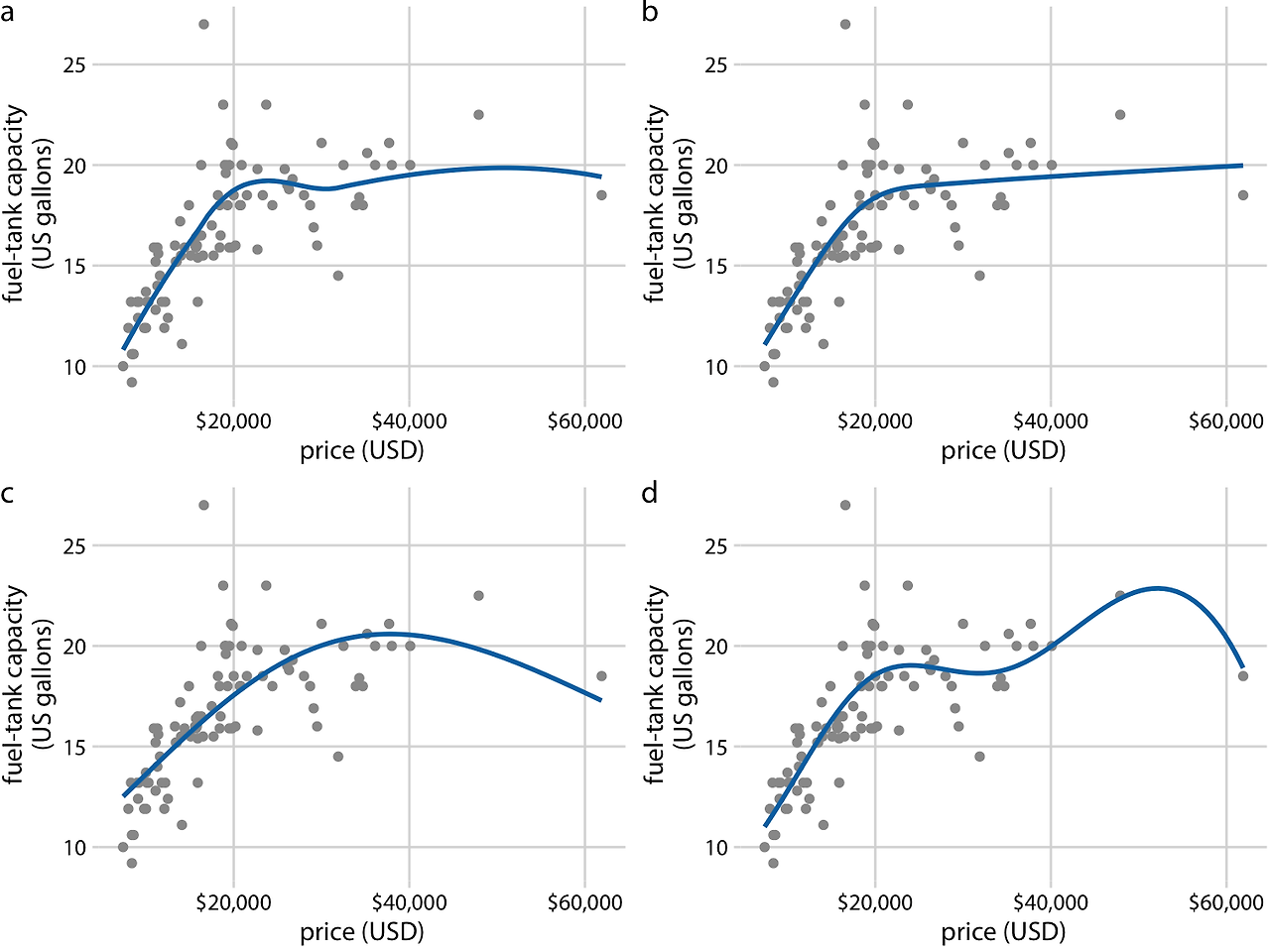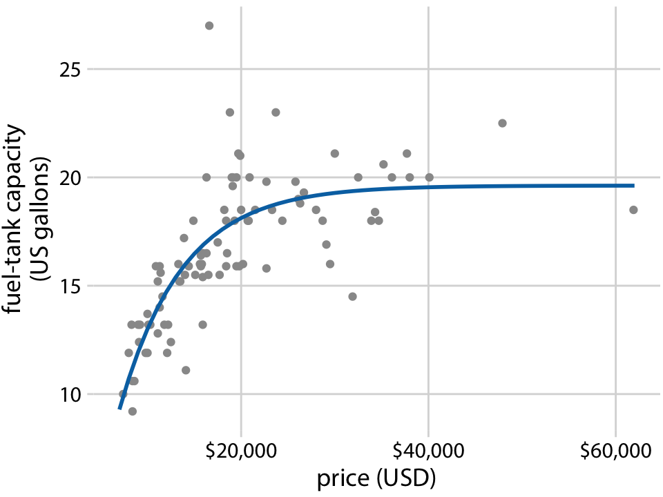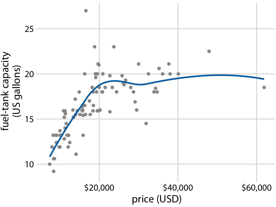 또한, LOESS는 시계열 데이터에 국한되지 않고 임의의 산점도에도 적용될 수 있습니다. LOESS 선은 가격이 저렴한 자동차(20,000달러 이하)의 경우 탱크 용량이 가격과 거의 선형적으로 증가하지만, 더 비싼 자동차에서는 이 관계가 완만해진다는 것을 보여줍니다. 약 20,000달러 이상의 가격대에서는 더 비싼 자동차를 구매하더라도 더 큰 연료 탱크를 얻을 수 없다는 결론을 내릴 수 있습니다.