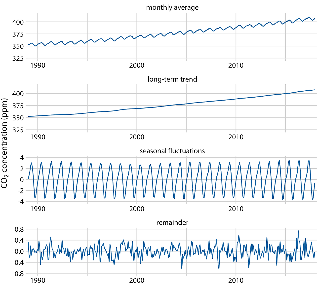 분해된 결과는 지난 30년 동안 CO2 농도가 50ppm 이상 증가했음을 보여줍니다. 이에 비해, 계절 변동은 8ppm 미만으로, 장기적인 추세에 비해 4ppm 이상의 증가나 감소를 일으키지 않습니다.나머지 구성 요소는 1.6ppm 미만이며, 이는 월별 CO2 농도 측정에서의 랜덤 노이즈에 해당합니다.