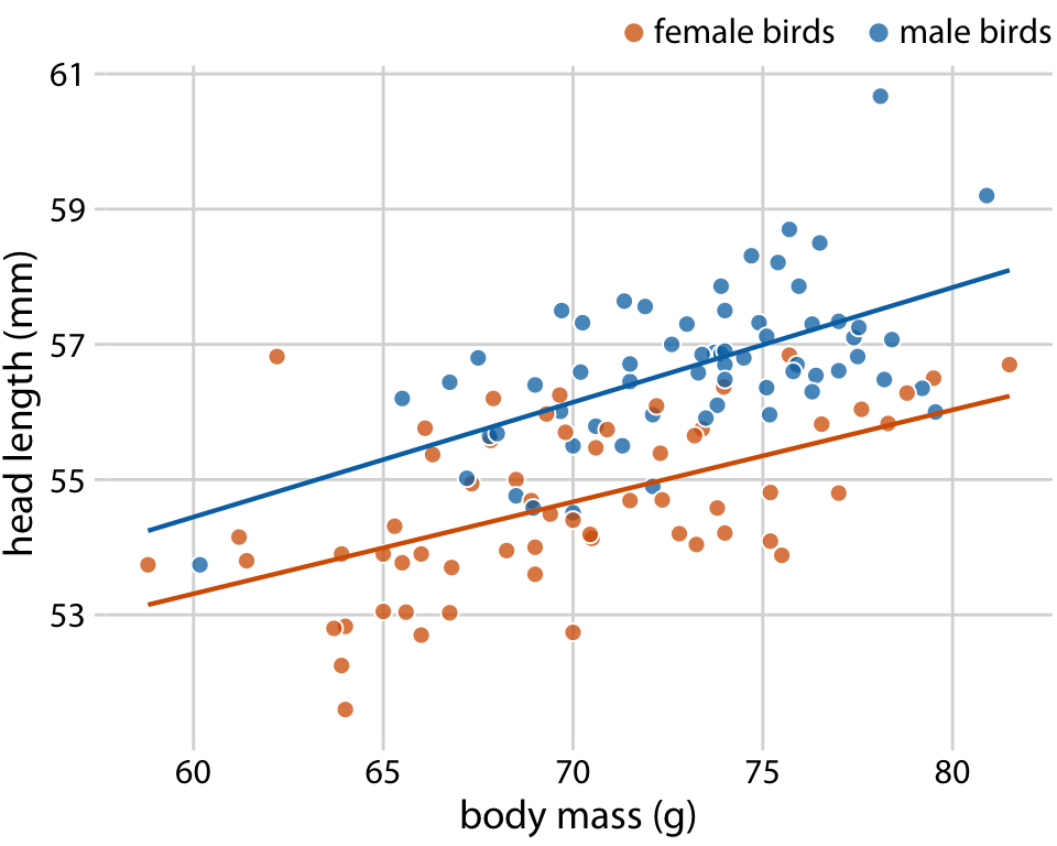 두 변수 간의 관계가 대략적으로 선형일 때, 이 단순한 직선 모델이 매우 효과적입니다. 실세계 데이터셋에서 이러한 선형 관계는 놀라울 정도로 흔합니다. 예를 들어, Chapter 12에서 blue jays 새의 머리 길이와 체중 사이의 관계가 남녀 모두에서 대략적으로 선형 관계를 보이는 것으로 논의되었습니다. 이러한 선형 추세선을 산점도에 그려주면, 독자가 데이터 내의 추세를 더 쉽게 파악할 수 있습니다