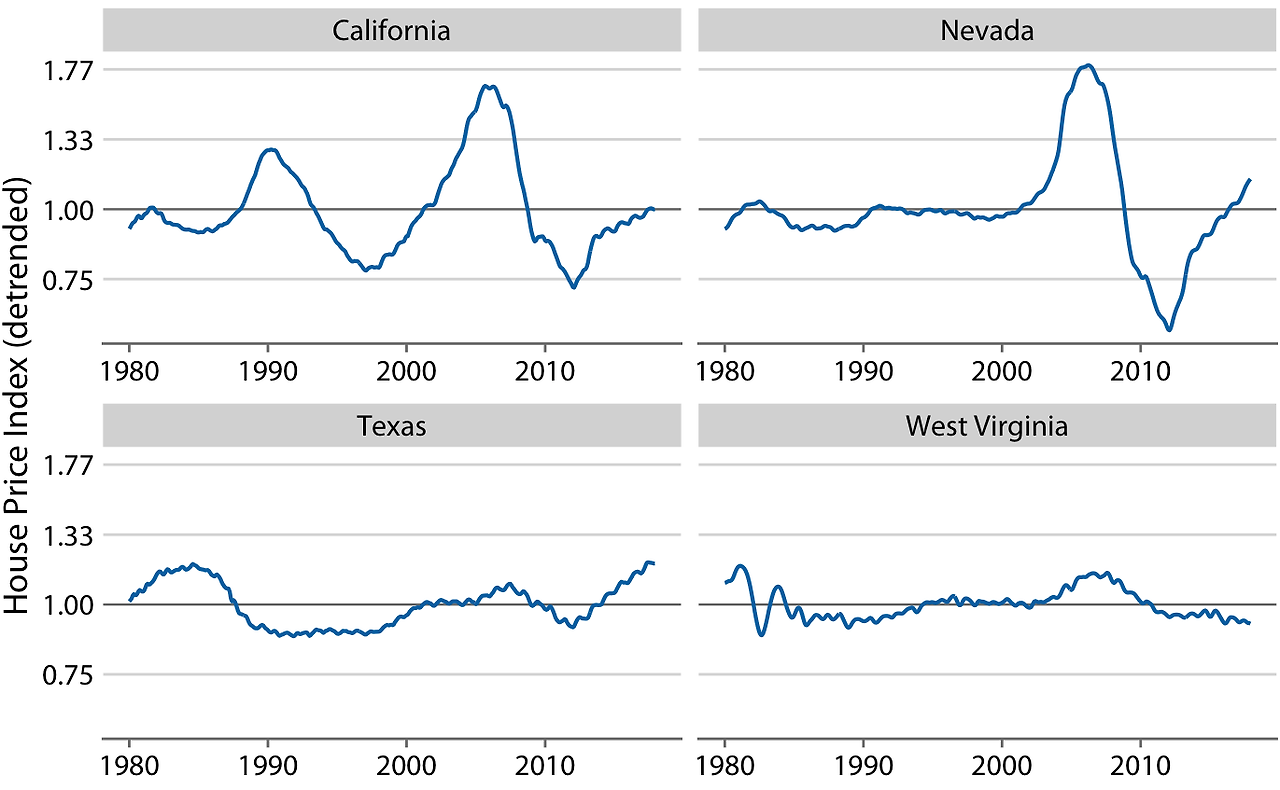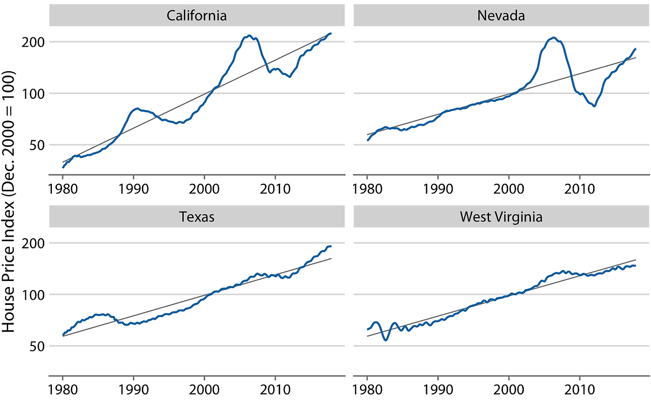 장기간 동안 주택 가격은 일반적으로 인플레이션과 비슷한 연간 성장률을 보입니다. 그러나 이 추세에 주택 시장의 버블이 겹쳐지면서 심한 붐과 버스트 사이클을 겪기도 합니다. 네 개의 미국 주에 대한 실제 주택 가격 지수와 그 장기적인 추세를 보여줍니다. 1980년부터 2017년까지 캘리포니아는 1990년과 2000년대 중반에 두 번의 버블을 겪었고, 네바다는 2000년대 중반에 한 번의 버블을 경험했습니다. 반면, 텍사스와 웨스트 버지니아의 주택 가격은 해당 기간 동안 장기적인 추세를 비교적 일관되게 따랐습니다. 주택 가격이 퍼센트 단위로 증가하는 경향이 있기 때문에, 로그 y축을 사용했습니다. 이 직선들은 캘리포니아의 연간 4.7% 가격 증가와 네바다, 텍사스, 웨스트 버지니아의 각각 연간 2.8% 가격 증가를 나타냅니다.