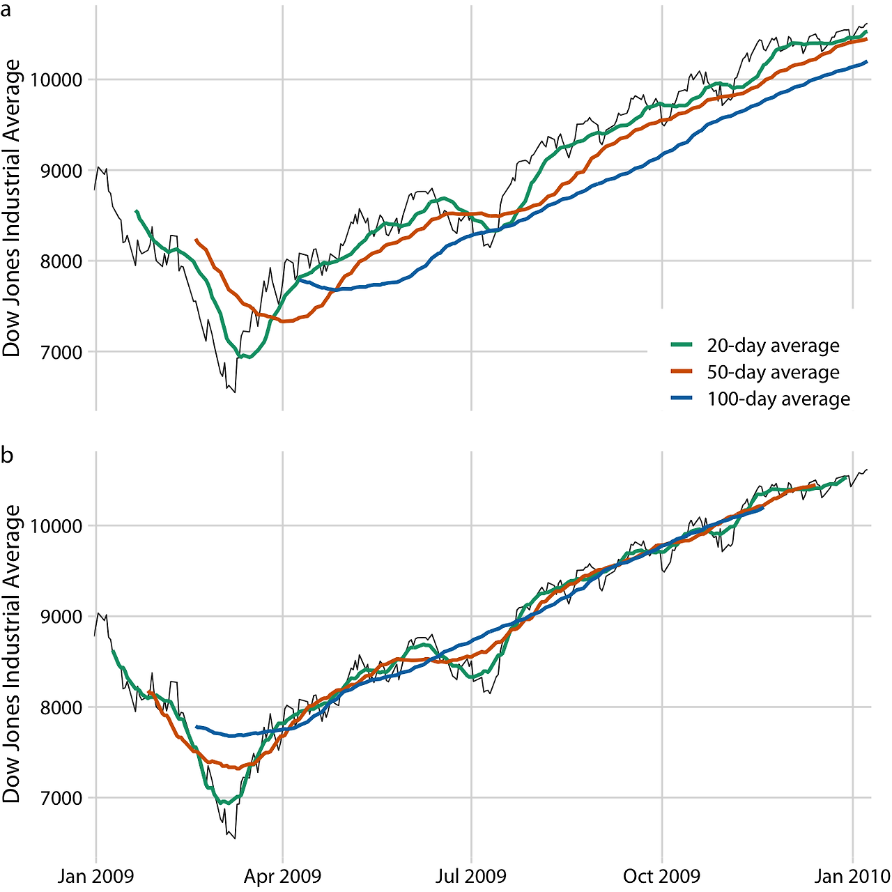 이 이동 평균 시계열을 플로팅할 때, 각 시간 창의 평균을 어느 시점과 연관시킬지를 결정해야 합니다. 금융 분석가들은 보통 각 평균을 해당 시간 창의 끝에 위치시키는데, 이는 원래 데이터보다 뒤처진 곡선을 생성합니다. 더 큰 시간 창을 사용할수록 이러한 지연이 더욱 심해집니다. 반면, 통계학자들은 평균을 시간 창의 중심에 위치시켜, 원래 데이터와 완벽하게 겹치는 곡선을 생성합니다.