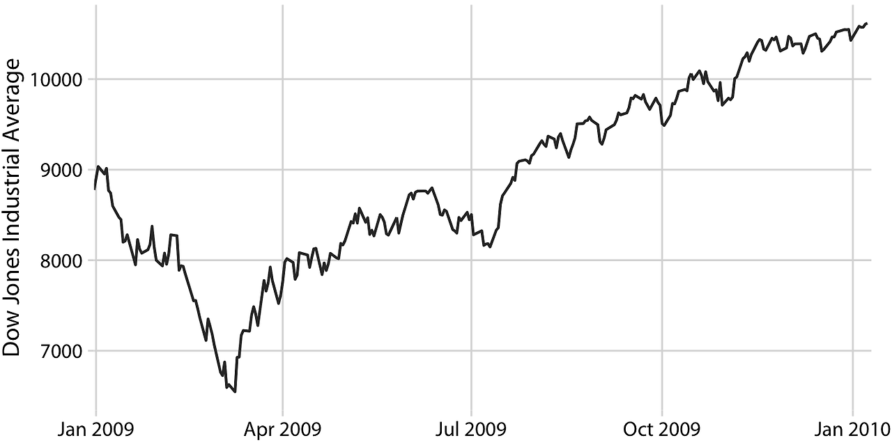 2008년 금융 위기 직후인 2009년을 살펴보고 있습니다. 2009년 첫 3개월 동안 시장은 2400포인트 이상(~27%) 하락했으며, 그 후에는 연말까지 서서히 회복되었습니다. 이러한 장기적인 추세를 시각화하면서 단기적인 변동은 덜 강조하는 방법을 생각해볼 수 있습니다.