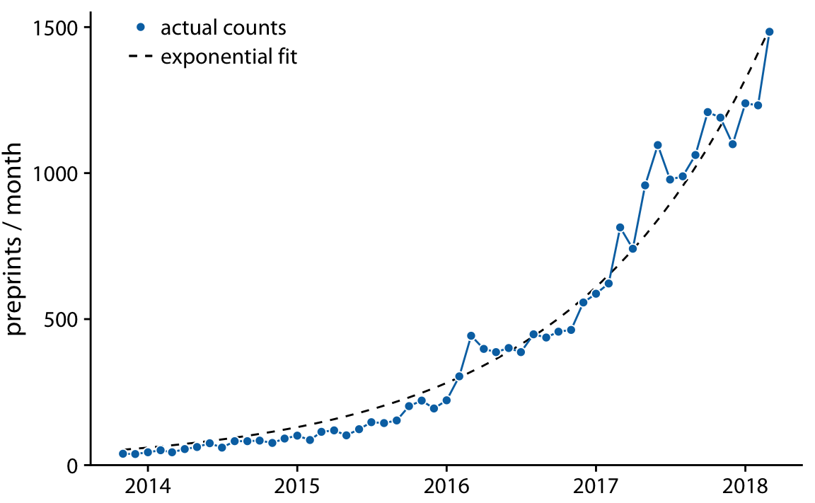 이 가정이 bioRxiv 데이터에 잘 맞는 것으로 보이며, 지수 함수 형태의 곡선 y=A⋅exp(mx)가 bioRxiv 제출 데이터에 잘 맞습니다.