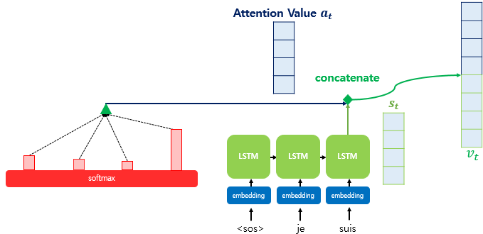 어텐션 함수의 최종값인 어텐션 값 a_t을 구했다. 어텐션 값이 구해지면 어텐션 메커니즘은 a_t를 s_t와 결합(concatenate)하여 하나의 벡터로 만드는 작업을 수행한다. 이를 v_t라고 정의하면, v_t를 \hat{y} 예측 연산의 입력으로 사용하므로서 인코더로부터 얻은 정보를 활용하여 \hat{y}를 좀 더 잘 예측할 수 있게 된다.