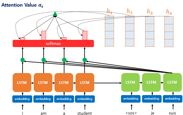 Attention 메커니즘에서는 Attention Value 값을 필요로 한다. t번째 단어를 예측하기 위한 어텐션 값을 a_t라고 정의한다.
