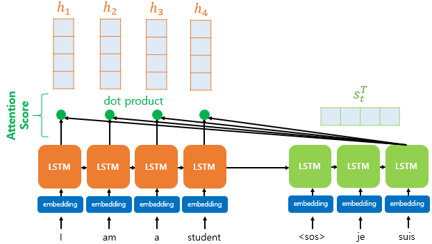 dot-product attention은 이 스코어 값을 구하기 위해 s_t를 전치하고, 각 hidden state와 내적을 수행한다. 즉, 모든 어텐션 스코어 값을 스칼라이다.